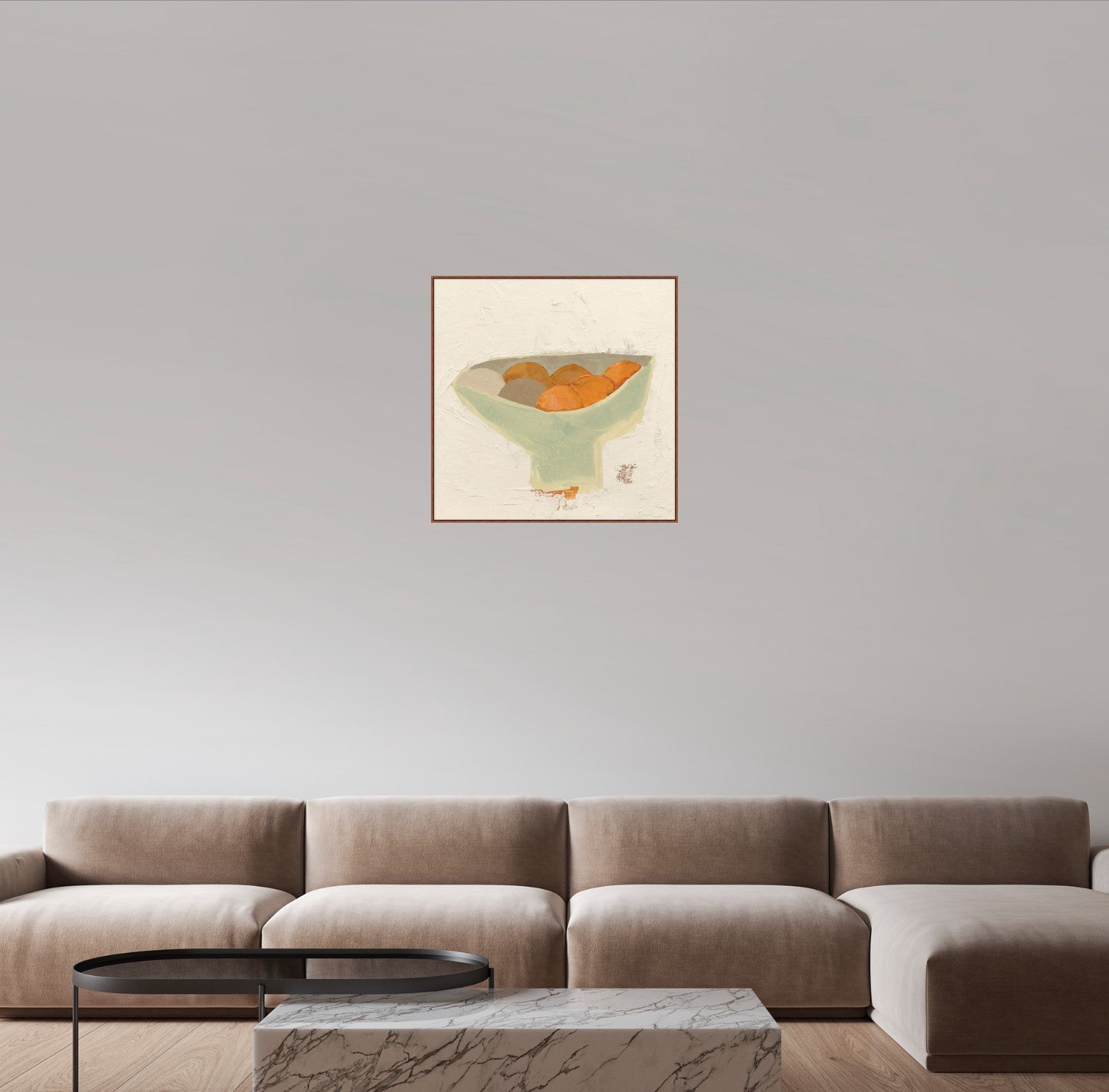 Abstract Bowl of Oranges plays with nostalgia and abstraction—evoking midcentury form with a modern, graphic treatment. Muted orange tones and simplified shapes offer a refreshing twist on the classic still life.