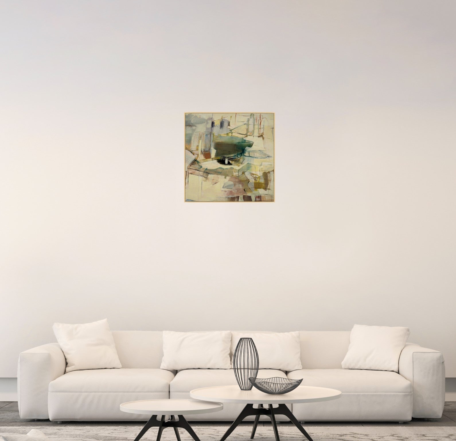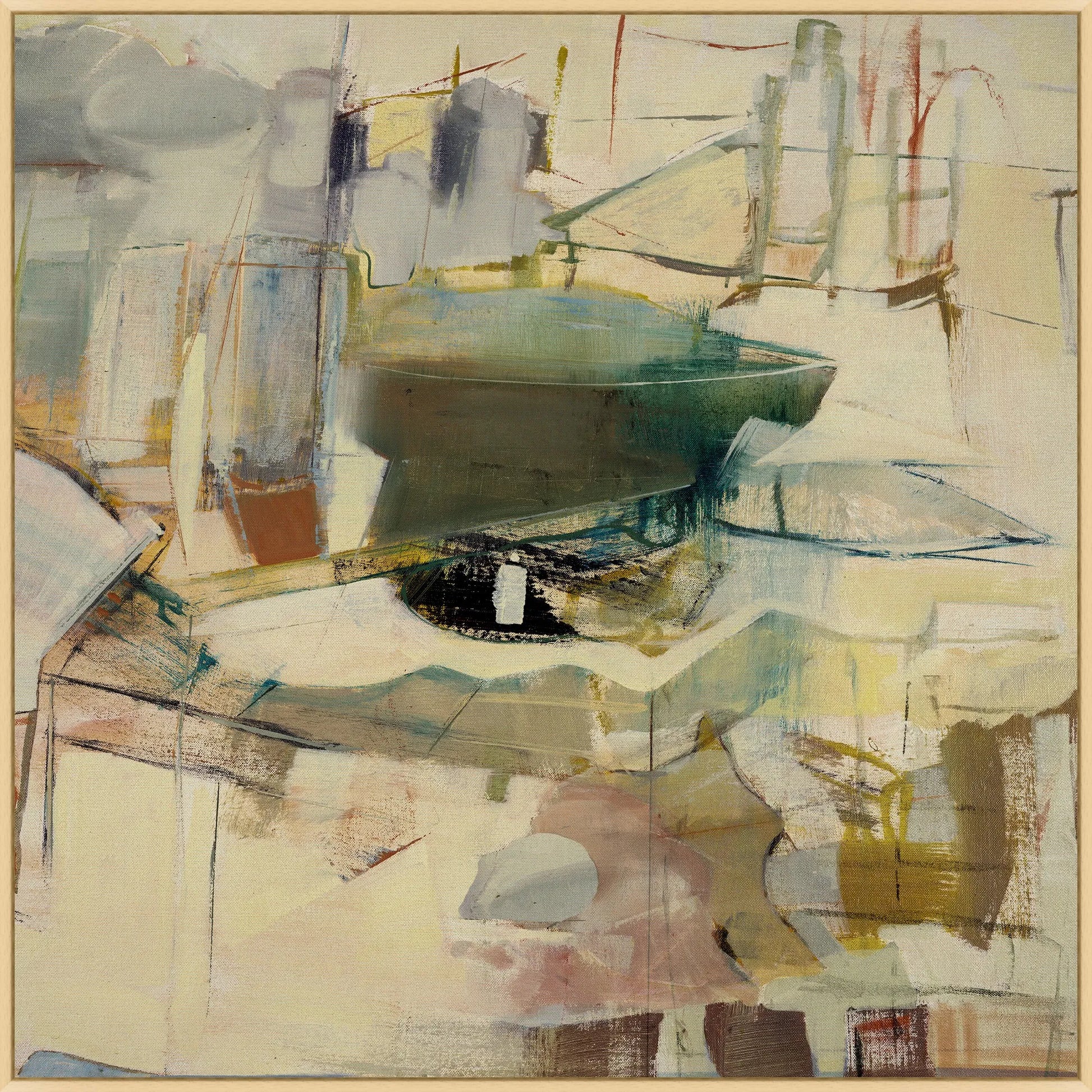 Deconstructed Still Life abstracts traditional subjects into clean geometry. Its raw canvas surface and earthy tones feel grounded yet elevated.