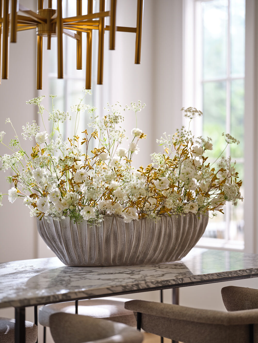 Let it anchor a dining table or pair with tall sculptural vessels for striking height contrast.