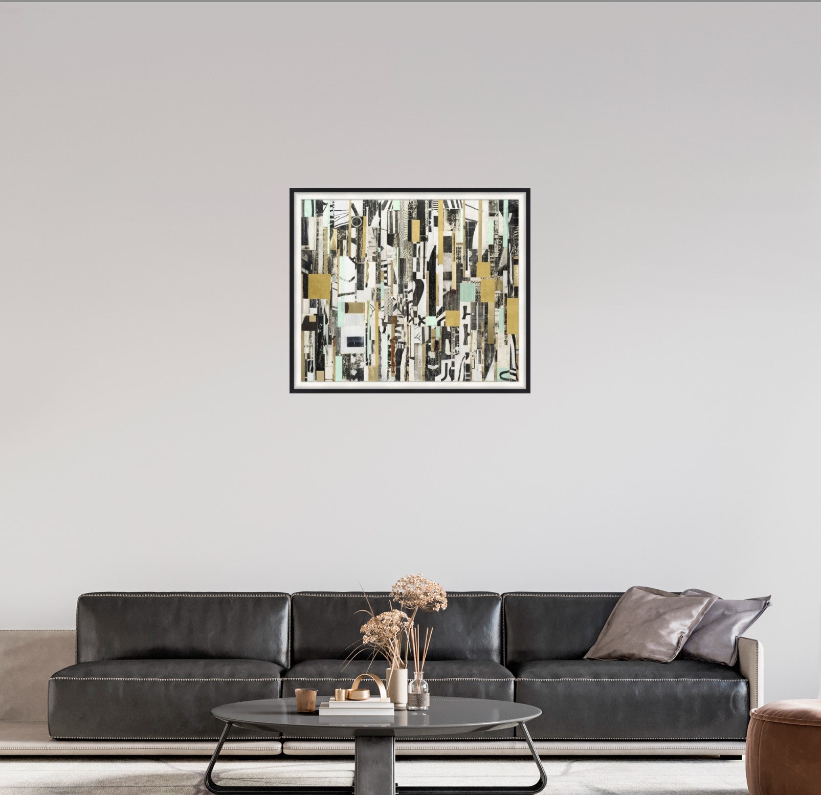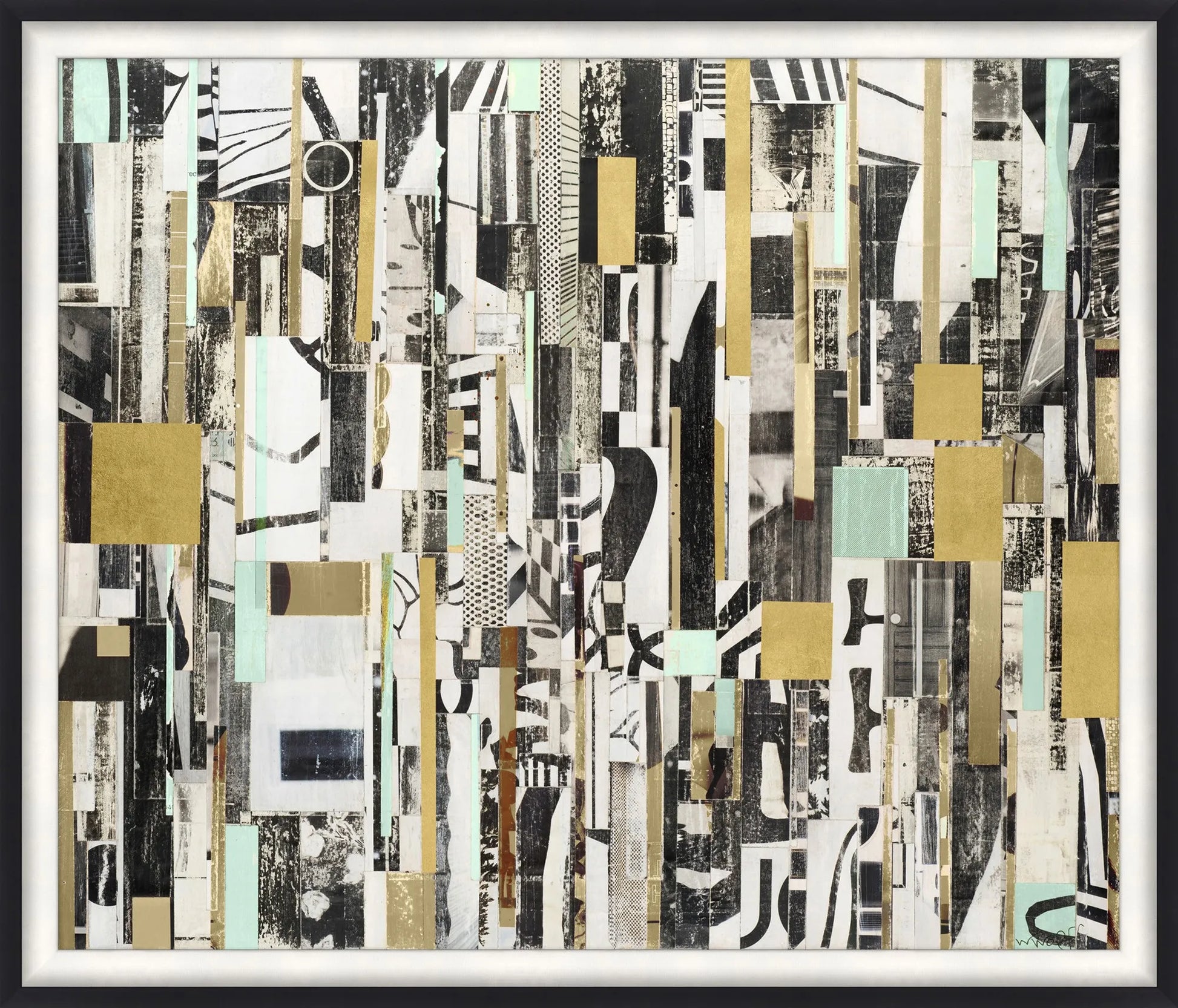 Modern Times Collage brings together bold shapes, layered textures, and eclectic patterns in a striking mixed-media composition. Its dynamic arrangement of gold, black, and mint hues creates a visually captivating focal point with a contemporary edge.