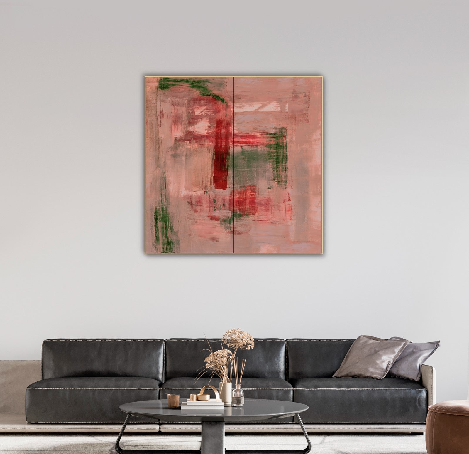 Pink Abstract Panels brings together broad, expressive brushstrokes in rich tones of pink, red, and green. The diptych format creates a striking visual impact, with layered textures that draw the eye and add depth.