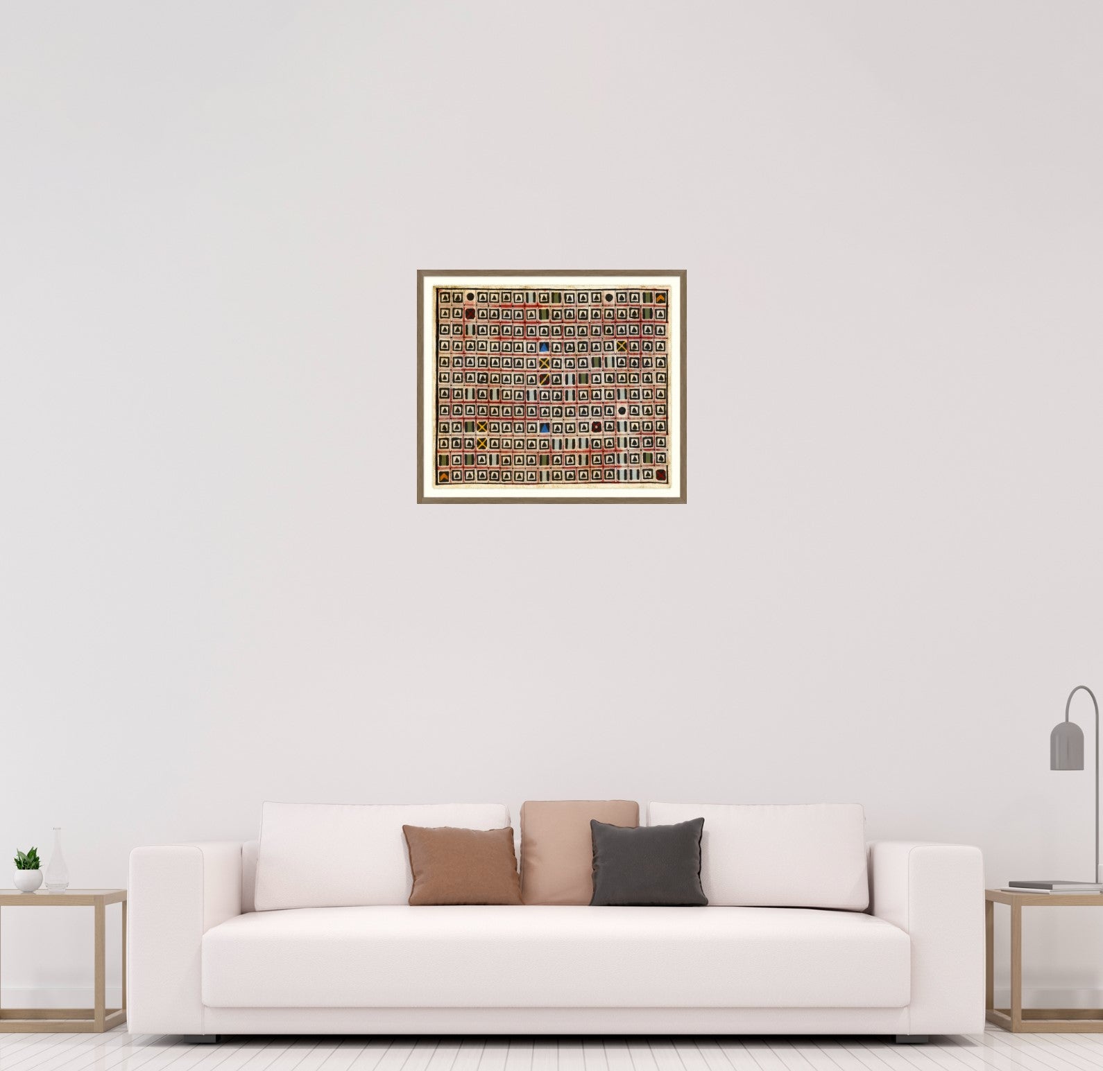 Pattern Grid captivates with its structured arrangement of geometric forms, each square holding its own unique symbol. The rhythmic composition and subtle pops of color evoke a sense of order and intrigue, perfect for modern spaces.