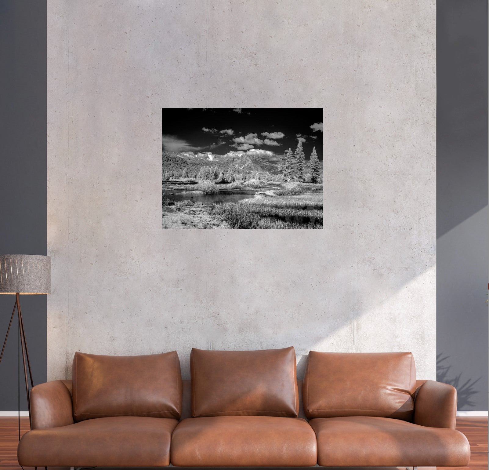 Yosemite Lake Landscape reflects the serene, mirror-like surface of a Yosemite lake, framed by towering pines and majestic peaks. The monochromatic palette heightens its serene, meditative quality.